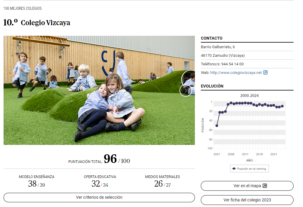 Nuevamente, el diario El Mundo nos sitúa en 2024 como uno de los mejores centros educativos a nivel estatal. En el 25º aniversario de su ranking "Los 100 mejores colegios de España", ocupamos la 10ª posición, con 96 puntos (criterios de selección), empatados con el sexto y a un solo punto del primero. Esto nos refleja como el mejor centro educativo de Euskadi y también como el mejor centro concertado laico a nivel estatal.